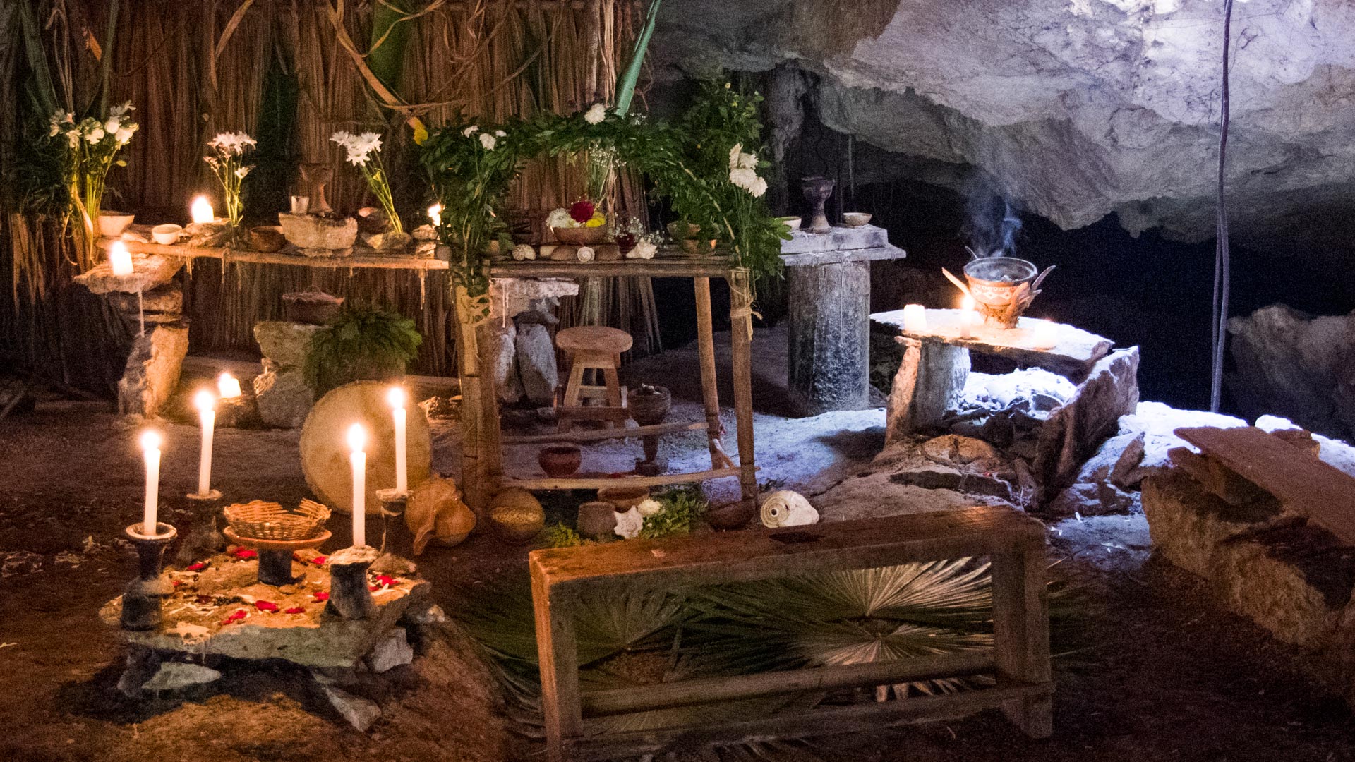 Nuestro tercer cenote es un colapso que formó una pequeña isla rodeada de agua que funciona como nuestro centro ceremonial.